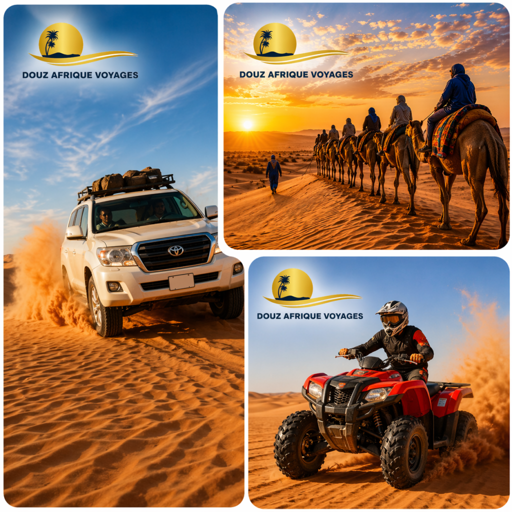Welcome to Douz Afrique Travel Agency, your gateway to the Sahara Desert in Douz. We specialize in creating authentic and unforgettable desert experiences, from camel trekking and 4x4 safaris to quad adventures and trekking tours.